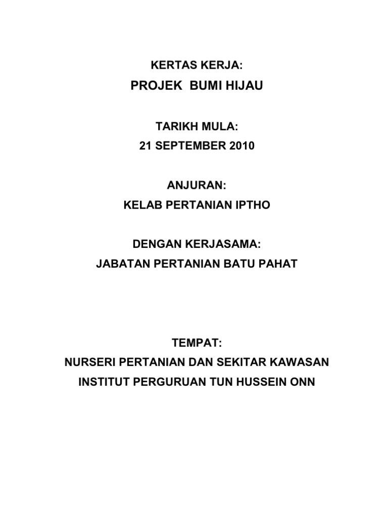 Contoh kertas kerja persatuan briged sukarelawan uitm cawangan johor kampus segamat sesi mac ogos 2022 kertas kerja program kesedaran patriotisme dalam kalangan. Jabatan pertanian batu pahat. Contoh Kertas Kerja Program Bumi Hijau.